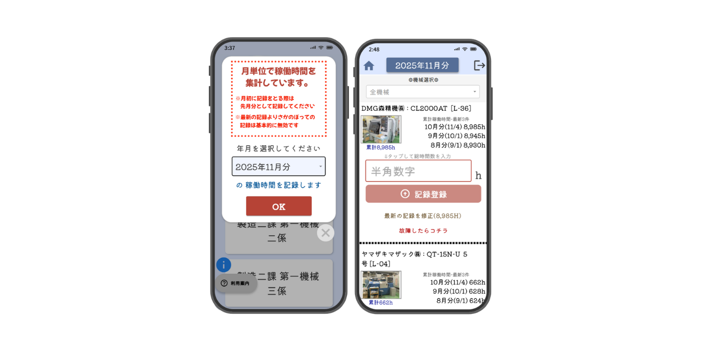 従来は、社内に約90台ある工作機械の稼働時間を担当者が紙に記録し、月に1回、管理者が全ての記録をExcelに転記して稼働率を算出・集計していました。このアプリでは、各現場がモバイル版から月末に入力するだけで、管理者は 全機械の稼働状況を集計できます。さらに、管理用PC画面では稼働状況をグラフで自動表示し、業務負担の大幅削減と見える化を同時に実現しました。